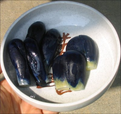 誰でも知っている茄子漬ですがお店で買うと高いでしょうね。簡単ですから茄子を一袋買ってきて自分で作ってみませんか?美味しいし安いしご飯がいっ ぱい食べられて夏バテしませんよ。向かって右側の茄子は新潟で有名な「十全茄子」、左は「水茄子」です。歯ざわりと味わいが違います。