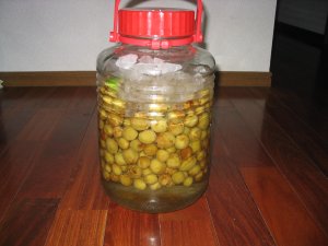 梅4キロ、氷砂糖4キロ、焼酎35度800cc、ビンは8リットル以上入るもの(大きいものが無いときは氷砂糖を1袋ずつ入れて翌日にでも溶けたらまた追加で入れる)