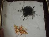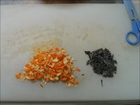 材料:白菜(今回は1400g白菜1/2個)、塩(42g、白菜の3%)、陳皮(約10g、中央の写真の下側、みかんの皮の干したもの)、刻み昆布(約6~7g、中央の写真の黒いもの)、鷹の爪1~2本(種は抜いておく)