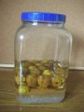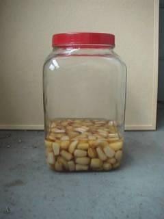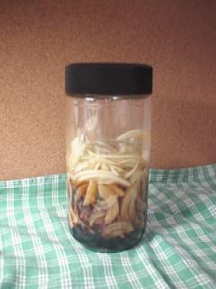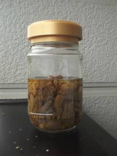 5.翌日になったら塩水を捨てて、用意したビンにらっきょうと漬け汁を入れて涼しいところに半年間置くと出来上がる。(この間は長いけど美味しくなります)