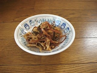 酸味が利いて箸休めにいいですよ、人参を入れたら紅白でお正月料理になるし、スルメが無かったら宮崎のハリハリ漬けになります。