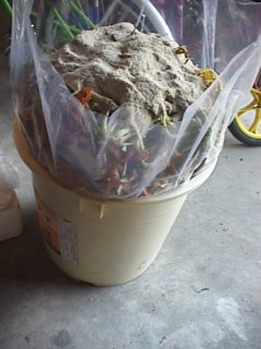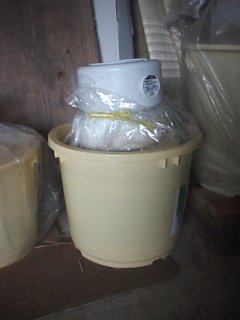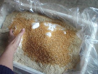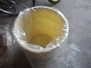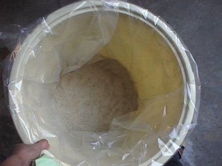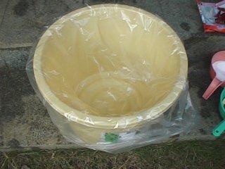 ↓桶にビニール袋を入れる。 ↓最初に混ぜ合わせたこぬかを少し敷いておく。