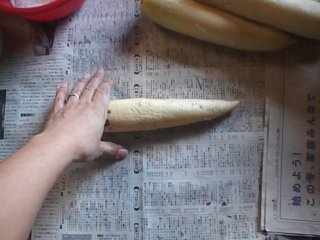 ↓干し大根を転がしてもむ。 ↓こぬか、ざらめ、塩を混ぜる。