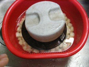 押し蓋をして重石はたくあんの2倍、今回は60キロ、水が上がってきたら重石は順次減らして水が被るくらいを維持する。